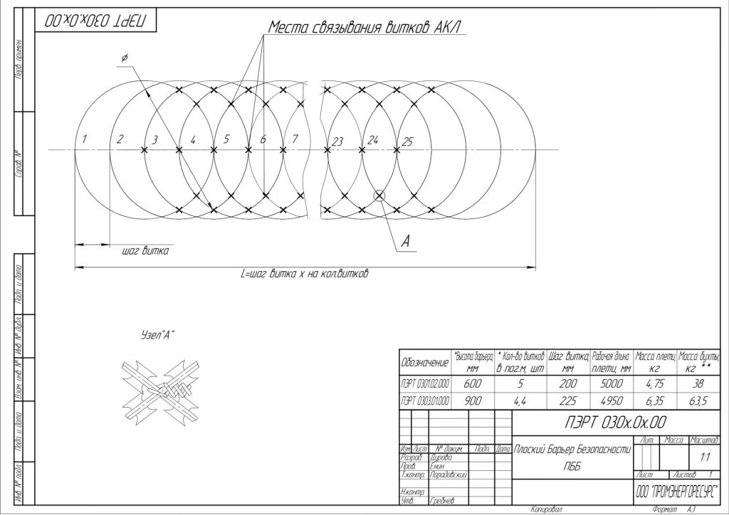 Плоский Барьер Безопасности (ПББ) представляет собой плоскую, спиралевидную конструкцию из армированной колючей ленты, соседние витки которой, также как и у СББ, скрепляются между собой особым образом.
